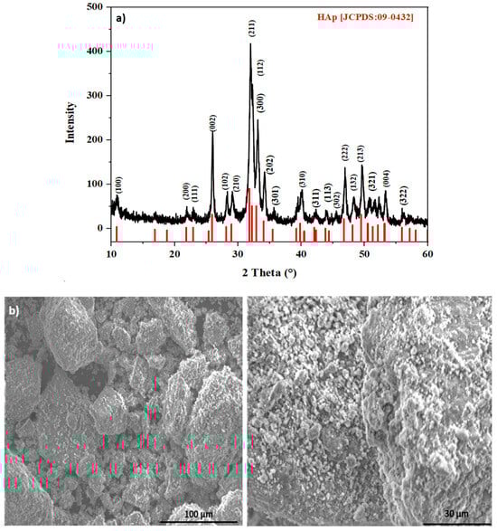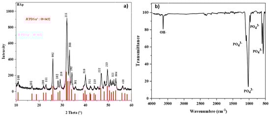 The XRD pattern and ATR-FTIR spectrum of the calcined powder (Figure 3a) showed the existence of a well-crystallized phase corresponding to HAp without noticing any other crystalline phase.