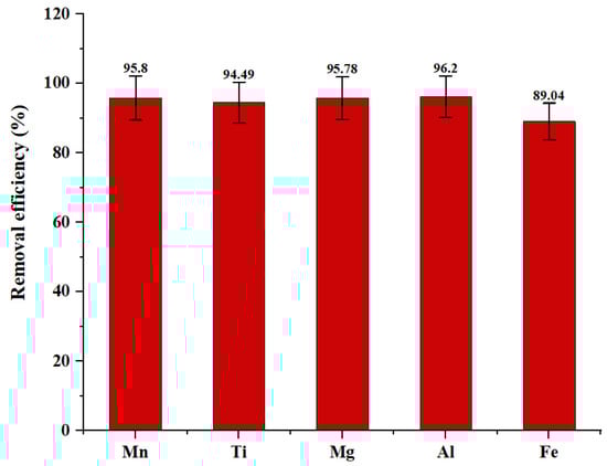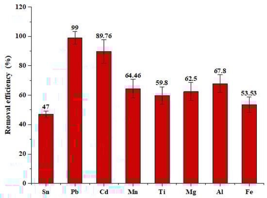 Analyzing the removal efficiency (Figure 4), it is evident that the precipitation of the phosphorus and calcium ions existing in the c-Liq into HAp effectively eliminated a broad spectrum of metal ions. Specifically, the removal rates were 47.01% for Sn, 89.76% for Cd, and 99.02% for Pb, while Mn and Ti exhibited removal rates close to 60%. For the main elements such as Mg, Fe, and Al, the removal percentage ranged mainly between 53% and 65%.