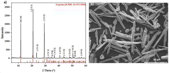 On the other side, GP generated as a byproduct during the digestion of the purified HAp with sulfuric acid was also washed with distilled water and then characterized. The XRD diffractogram provided in Figure 8a indicates the formation of a highly crystalline phase with narrow peaks attributed all to calcium sulfate dihydrate or GP (PDF N°: 01-072-0596). Furthermore, the main mineral impurities usually observed such as brushite (CaHPO4·2H2O), silicaluminate, or fluorine compounds (CaSiF6 or CaF2) were absent. The SEM image displayed that needle-shaped crystals having a size varying from 40 to 120 μm (Figure 8b) were obtained.