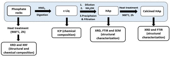 Scheme 1 depicts the sequential steps involved in the HAp precipitation from natural phosphate, along with the characterization techniques applied at each phase.