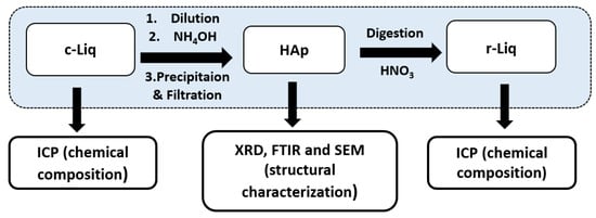 The preparation of HAp was performed by adjusting the pH of the diluted c-Liq (source of Ca2+ and PO43−) to values higher than 9 by adding 2 M ammonia solution under continuous stirring at room temperature (Equation (2)).