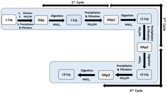 Therefore, the development of an innovative concept to purify the produced HAp could represent a potential avenue to maximize the valorization of natural phosphate resources. In this study, we explored a promising method to eliminate a broad range of metallic ions from the c-Liq and produce less-contaminated HAp via a wet process utilizing the dissolution–precipitation technique. The suggested method is a non-selective two-step process to clean the prepared HAp from cationic impurities offering an inexpensive and rapid decontamination approach. In the first step, the c-Liq digested from phosphate rocks was transformed into HAp using ammonia solution at room temperature. This ensures the formation of a solid phase containing calcium and phosphate ions with fewer hazardous elements. Next, HAp was dissolved using diluted nitric acid to recover its constituent elements, facilitating the evaluation of their elimination efficiency. To improve the purification process, three consecutive DP cycles were conducted on the same HAp powder.