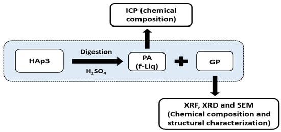 After reducing impurities, the purified HAp (HAp3) was digested with sulfuric acid to generate high-quality PA and GP (Equation (4)) [54]: