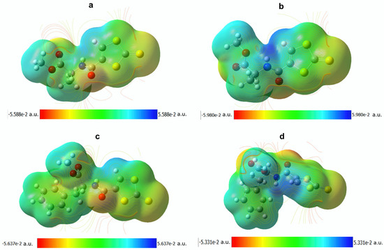 The Molecular electrostatic potential (MEP) in atomic units (a.u.) and their contours of the compounds (a–d).