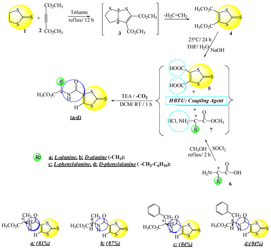 The final step was the reaction between the substrate 2-thioxo-1,3-dithiol-4,5-dicarboxylic acid (5) and the four methylated amino ester hydrochloric acid salts (L-alanine-OMe, D-alanine-OMe, L-phenylalanine-OMe, D-phenylalanine-OMe). It takes an hour for the reaction to complete at room temperature, facilitated by hexafluorophosphate benzotriazole tetramethyl uronium (HBTU) as a coupling agent, in a basic medium with triethylamine (TEA) and dichloromethane (DCM) as suitable solvents, while maintaining ideal conditions [20,21,22,23]. Compounds (a–d) synthesized in (Scheme 1) were purified by liquid chromatography with silica gel as the stationary phase, yielding 81% to 89%. The confirmation of their chemical structures was established through analysis by both 1H and 13C NMR spectroscopy, as well as high-resolution mass spectra (HRMS), adhering to scientific methodologies in the field of organic synthesis and chemical analysis.