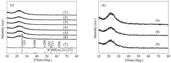 The XRD patterns of the SiO2-RH, pure TiO2, and TS-RH-x samples (a), and the fresh and regenerated TS-RH-2.5 samples (b): (1) SiO2-RH, (2) TS-RH-0.5, (3) TS-RH-1.0, (4) TS-RH-2.5, (5) TS-RH-5.0, (6) TS-RH-10, (7) pure TiO2, (8) TS-RH-2.5c regenerated from the 15th ODS reaction of DBT, and (9) TS-RH-2.5c regenerated from the 15th ODS reaction of 4,6-DMDBT.
