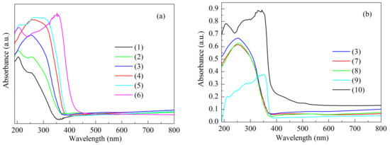 UV-Vis spectra of the pure TiO2, and TS-RH-x samples (a), and the fresh and regenerated TS-RH-2.5 samples, and oxidation products of DBT and 4,6-DMDBT (b): (1) TS-RH-0.5, (2) TS-RH-1.0, (3) TS-RH-2.5, (4) TS-RH-5.0, (5) TS-RH-10, (6) pure TiO2, (7) TS-RH-2.5c regenerated from the 15th ODS reaction of DBT, (8) TS-RH-2.5c regenerated from the 15th ODS reaction of 4,6-DMDBT, (9) oxidation product of DBT, and (10) oxidation product of 4,6-DMDBT.