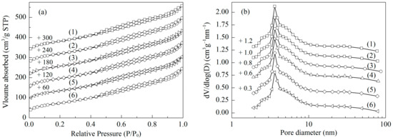 The XRD patterns were recorded with Cu-Kα radiation on a Panalytical Empyrean X-ray diffractometer (Malvern Panalytical Ltd., Malvern, UK) with a scanning angle (2θ) of 10–80°. The UV-Vis spectra were measured by a Lambda 650S spectrometer (PerkinElmer Inc., Shelton, CT, USA) with a spectral range of 190–800 nm. The FT-IR spectra were measured by a Nicolet 6700 infrared spectrometer (Thermo Fisher Scientific Inc., Waltham, MA, USA) with a pure KBr background. Measurements were made over a wavelength range of 400–4000 cm−1. The SEM images and elemental maps were taken by a TESCAN MIRA3 field emission scanning electron microscope (TESCAN ORSAY Holding, a.s., Brno, Kohoutovice, Czech Republic) equipped with an XFlash Detector 630M energy dispersive spectrometer (EDS, Bruker Nano GmbH, Berlin, Germany). The TEM images were collected by an FEI TECNAI F20 transmission electron microscope (FEI Inc., Hillsboro, OR, USA). The elemental contents of the samples were determined by a PerkinElmer Optima 8000 inductively coupled plasma emission spectrometer (PerkinElmer Inc., Shelton, CT, USA). About 100 mg of the sample was placed in a high-pressure digestion jar, 2.0 mL of aqueous hydrofluoric acid (40%) was added, and low-temperature digestion (2 h at 323 K) was carried out in microwave digestion apparatus (MARS6, CEM Corporation, Matthews, NC, USA). After digestion, the solution was diluted and fixed in a plastic volumetric flask. Blanks were subjected to the same procedure. In addition, a mixed standard solution of silicon and titanium was prepared using standard stock solutions, the absorbances were measured at the set wavelengths, and the standard curves were drawn. The sample solutions were measured and their elemental contents were calculated from the standard curve. Two parallel samples were made for each sample and the final result was taken as the average of the two measurements. The N2 adsorption–desorption isotherms were carried out on a Micromeritics ASAP 2020HD88 physical adsorption instrument (Micromeritics Instrument Corporation, Norcross, GA, USA) at 77 K. Prior to analysis, all of the samples were degassed at 573 K for 4 h. The specific surface area (SBET) was determined by the BET equation. The cumulative pore volume (Vmeso) and pore size distribution were calculated by the Barrett–Joyner–Halenda (BJH) model from the desorption branch of the N2 physisorption isotherms. The absorption spectra and standard curves of the DBT and 4,6-DMDBT model oils were determined by a TU–1900 UV-Vis spectrophotometer (Beijing Puxi general instrument Co., Ltd., Beijing, China). The oxidized products of DBT and 4,6-DMDBT were analyzed by high-resolution liquid chromatography–mass spectrometry (LC-MS, Triple TOF 5600+, AB SCIEX Ltd., Framingham, MA, USA), a hybrid triple quadrupole time-of-flight mass spectrometer equipped with an ESI source operating in positive ion mode.
