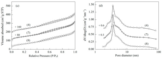N2 adsorption–desorption isotherms (a,c) and pore size distribution curves (b,d) of the samples: (1) SiO2-RH, (2) TS-RH-0.5, (3) TS-RH-1.0, (4) TS-RH-2.5, (5) TS-RH-5.0, (6) TS-RH-10, (7) TS-RH-2.5c regenerated from the 15th ODS reaction of DBT, and (8) TS-RH-2.5c regenerated from the 15th ODS reaction of 4,6-DMDBT.