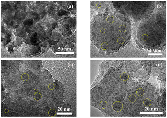 TEM images of the samples: (a) SiO2-RH, (b) TS-RH-2.5, (c) TS-RH-2.5c regenerated from the 15th ODS reaction of DBT, and (d) TS-RH-2.5c regenerated from the 15th ODS reaction of 4,6-DMDBT.