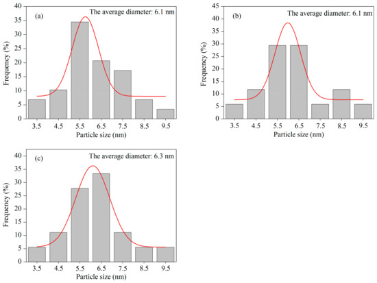 Particle size distribution histograms of the samples: (a) TS-RH-2.5, (b) TS-RH-2.5c regenerated from the 15th ODS reaction of DBT, and (c) TS-RH-2.5c regenerated from the 15th ODS reaction of 4,6-DMDBT.