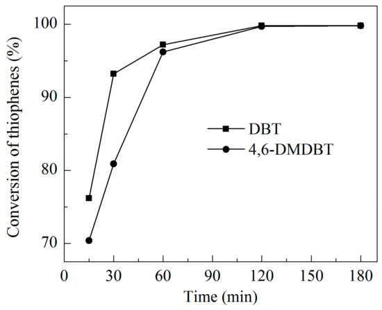 In order to investigate the reason for the good catalytic performance of the TS-RH-2.5 sample in the ODS of DBT and 4,6-DMDBT model oils, several blank reactions were designed and carried out under the reaction conditions in Table 1. When the catalyst was not involved in the reaction, the conversions of DBT and 4,6-DMDBT were 21.8 and 15.1%, respectively, indicating that the oxidizing effects of TBHP on DBT and 4,6-DMDBT were poor. When TS-RH-2.5 was used as the catalyst and no oxidant was added, the conversions of DBT and 4,6-DMDBT were 20.0% and 14.0%, respectively, indicating that the TS-RH-2.5 sample had a certain adsorption desulfurization effect, but this effect was poor [15]. Compared to the results of the catalyst blank experiment, the conversions of DBT and 4,6-DMDBT increased slightly when the SiO2-RH and pure TiO2 were used as the catalysts (see Table 1), indicating that the SiO2-RH and pure TiO2 were poorly active. Based on the above characterization results, as well as the results of the blank experiments, the good catalytic oxidative desulfurization performance of TS-RH-2.5 can be attributed to (1) its high specific surface area and mesopore volume and (2) the uniform dispersion of TiO2 grains with an average diameter of 6.1 nm on the surface of the mesoporous SiO2-RH carrier, which greatly increases the active sites of the sample, consequently improving its catalytic activity.