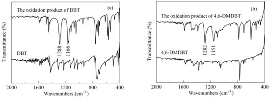 FT-IR spectra of the reactants and their corresponding products: (a) DBT and its oxidation product and (b) 4,6-DMDBT and its oxidation product.