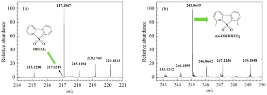 The oxidation products of DBT and 4,6-DMDBT were analyzed by the means of the FT-IR and LC-MS techniques. As shown in Figure 9a, compared with DBT, two new absorption peaks at 1166 and 1288 cm−1 appear in the oxidation product of DBT, which can be attributed to the symmetric and asymmetric stretching vibrations of the sulfone (O=S=O), respectively [26,27]. Similarly, the 4,6-DMDBT oxidation product presents new absorption peaks at 1151 and 1282 cm−1 (Figure 9b), which can be attributed to the symmetric and asymmetric stretching vibrations of the sulfone (O=S=O), respectively [26,27]. As shown in Figure 10, the ion peak at the mass to charge ratio (m/z) of 217.0319 matches well with the m/z of the dibenzothiophene sulfone (DBTO2) quasi-molecular ion ([M+H]+, 217.0318). Moreover, the ion peak at the m/z of 245.0619 has a good match with the m/z of the 4,6-dimethyldibenzothiophene sulfone (4,6-DMDBTO2) quasi-molecular ion ([M+H]+, 245.0631). The above results demonstrate that the oxidation products of DBT and 4,6-DMDBT are DBTO2 and 4,6-DMDBTO2, respectively. It is worth noting that the presence of sulfoxide is not detected in the FT-IR and LC-MS characterizations of the oxidation products of DBT and 4,6-DMDBT. This result indicates that sulfoxide would be very unstable in this reaction system and is further oxidized to the corresponding sulfone, which is consistent with the results reported in the literature [8,28].