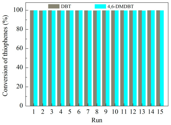 The absorbance of the oil phase at 236 nm (241 nm for 4,6-DMDBT model oil) was determined on a TU-1900 UV-Vis spectrophotometer using ethanol as the diluent solvent and reference solution. The standard curve method was used to calculate the amount of DBT remaining in the oil phase, and the standard curves of the DBT and 4,6-DMDBT model oils are shown in Figure 13. As can be seen from Figure 13, the linear regression equation of the DBT model oil is y = 1.16516 x, with a correlation coefficient R2 of 0.9999 and a linear range of 0–0.504 ppmw. Similarly, the linear regression equation for the 4,6-DMDBT model oil is y = 1.06447 x, with a correlation coefficient R2 of 0.9997 and a linear range of 0–0.501 ppmw. The conversions of DBT and 4,6-DMDBT (X) were defined as the amount of the sulfide reacted divided by the initial amount of the sulfide added.