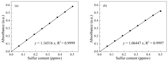 The standard curves of DBT (a) and 4,6-DMDBT (b) model oils.