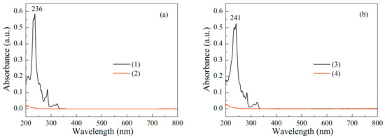 The absorption spectra of DBT (a) and 4,6-DMDBT (b) model oils before and after the ODS reaction catalyzed by the TS-RH-2.5 sample: (1) DBT model oil before the reaction diluted 2000 times, (2) DBT model oil after the reaction diluted 2000 times, (3), 4,6-DMDBT model oil before the reaction diluted 2000 times, and (4) 4,6-DMDBT model oil after the reaction diluted 2000 times.