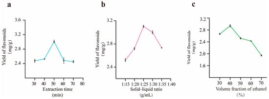 Single-factor test results ((a): extraction time; (b): solid–liquid ratio; (c): volume fraction of ethanol).