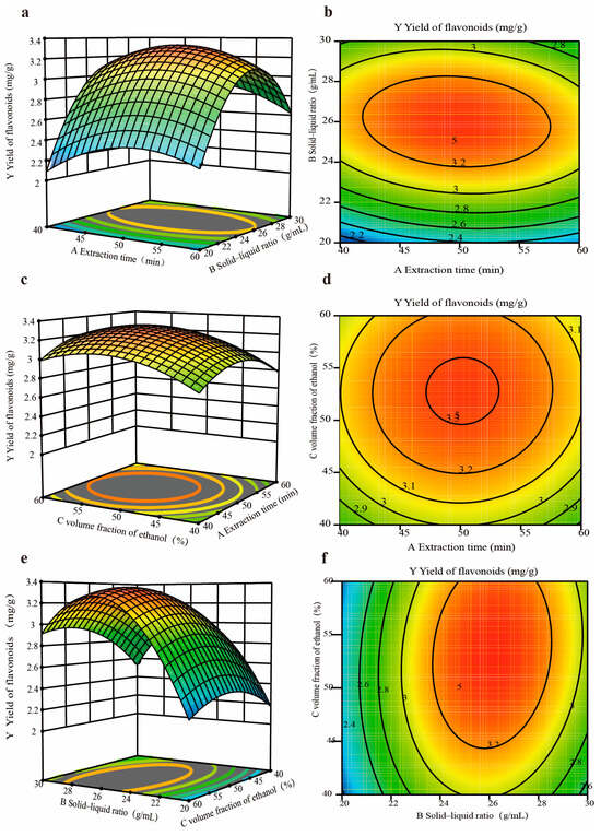 The RSM results of the flavonoid yield from PR are shown in Figure 2. A larger radian of the response surface and isocontours approaching ovals indicate that the interaction between the two factors is significantly greater [29]. As shown in Figure 2, the ordering of the response surface radian of the interaction between any two factors was 2e > 2a > 2c, and the ordering of the isocontour graphs presenting an oval degree was 2f > 2b > 2d. In the response surface plots of the interactions between any two factors of A, B, and C, it was observed that the response surface radian of 2c was the steepest, indicating that the interaction between B and C had the greatest impact on the yield of flavonoids from PR. When observing 2a and 3c, it was found that the radian of the side of the solid–liquid ratio was steeper, and the surface plot of the extraction time was the gentlest compared with that of the other two factors. This shows that the solid–liquid ratio had an extremely significant effect and that the effect of the extraction time on the response values was small. In the variance analysis results, the F-value of B was the largest compared with that of the other two factors, and its effect was significant, with a greater F-value and a lower p-value; this shows that the effect of factor B was the most pronounced, followed by the effect of factor C, with the effect of factor A being the lowest. This indicates that the response surface analysis results were consistent with the analysis of variance results in terms of the significance of the interactions of A, B, C, BC, AB, and AC.
