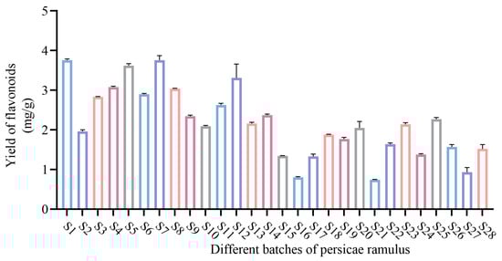 The flavonoid content in twenty-eight batches of PR was determined using the optimal extraction process after response surface optimization, and the results are shown in Figure 3 and Table S5. The batch with the highest yield of flavonoids was S1, at 3.76 ± 0.01 mg/g, and the batch with the lowest yield was S21, at 0.74 ± 0.01 mg/g. The results in the table were converted to a plot using GraphPad software (version 9.5.0).