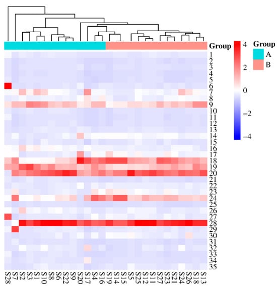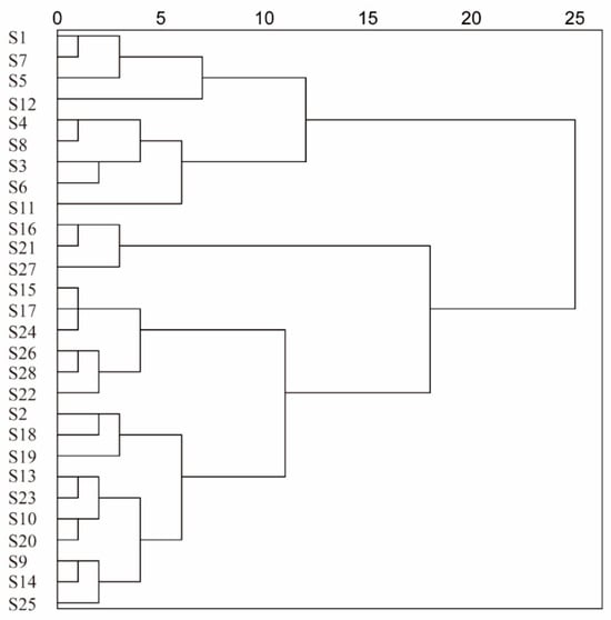 The areas of the 35 common peaks of the twenty-eight batches of PR were input into SPSS26.0 software. The interval of intergroup connection and Euclidean distance methods were adopted to analyze the HCA results of the PR samples, and Origin software (version 2021) was used to establish a visual analysis heatmap, as shown in Figure 8. The HCA results show that the PR samples were mainly divided into three categories when the connection distance between the groups was d = 15. The S1–S6 and S8–S27 samples were clustered into one category, the S7 sample was clustered into one category, and the S28 sample was clustered into another category. A comparison with the HCA results of the flavonoid content in PR revealed that these samples had good similarity but that there were differences in the chemical composition of the contents, which proves that the samples were not collected at the same time.