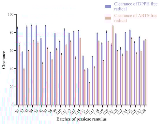 SPSS 26.0 software was used to analyze the data from the antioxidant activity assays, which are shown in Table S6 and transformed in Figure 5. In the DPPH free radical-scavenging assay, the S4 sample collected from Dangwu showed the highest scavenging activity, which reached 87.89 ± 0.63%, and the S16 sample was the batch with the lowest scavenging rate, which was 40.19 ± 0.37%. In the ABTS free radical-scavenging assay, the S21 sample was the strongest batch, with a clearance rate of 87.56 ± 0.40%, and the S16 sample was the weakest batch, with a clearance rate of 24.73 ± 0.49%, which shows that using only one indicator to evaluate antioxidant activity has limitations. A preliminary study of the antioxidant capacity of the flavonoid in PR revealed that the clearance rates of the DPPH and ABTS free radicals by the flavonoid extracts from the PR batches of S1, S5, S7, S9–S17, S19, and S22 were consistent with the flavonoid yield, which indicates that the levels of antioxidant activity differed with the flavonoid content in the extracts.