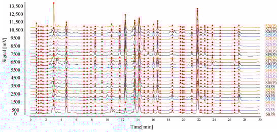 Through the experimental optimization of the system suitability conditions, the optimal conditions were determined for the UHPLC fingerprinting of the twenty-eight batches of PR samples. Regarding the elution conditions, the mobile phase gradient in Section 4.8.1 was used, as shown in Table S7, and the other chromatographic conditions were as follows: a detection wavelength of 290 nm, an analysis time of 30 min, 0.01% formic acid aqueous solution (A) and 0.01% formic acid acetonitrile (B) as the mobile phase, a flow rate of 0.2 mL/min, and a column temperature of 25 °C. Under these conditions, the UHPLC fingerprinting had more chromatographic peaks, and the peak intensities, peak shape, chromatographic resolution, and stability were better. Additionally, the baseline was steady, and the characteristic peaks in the samples completely appeared within 30 min. The results are shown in Figure S1.