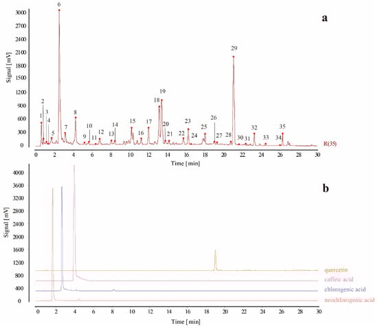 (a) UHPLC control fingerprinting of persicae ramulus (the numbers 1–35 represent common peaks in the twenty-eight batches of PR); (b) UHPLC fingerprinting of reference solution.