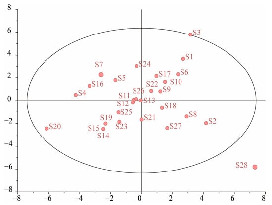 To further visualize the results, the data were imported into Simca software (14.0 version) to construct a principal component analysis score plot, as shown in Figure 9. The samples were mainly clustered into different areas. S28, which was distributed outside of the circle, was significantly different from the other samples in the discrete degree of the PCA score plot. The PCA results were consistent with the HCA and SA results, and they indicated differences in the chemical composition of the samples, which proves that the samples were not collected at the same time.