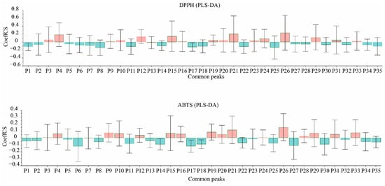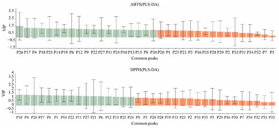 The DPPH and ABTS free radical-scavenging rates of the PR samples were used as dependent variables (X), and the common peak areas were used as the independent variables (Y). A PLS-DA was performed using SPSS 26.0 software, with the latent factor number set to 5. Then, the standardized regression coefficients and the VIP values were calculated to evaluate the correlation between PR and antioxidant activity. The results are shown in Tables S15 and S16, and the data of the peak area and the antioxidant test were transferred into Simca14.0 software to construct a VIP value plot (Figure 11) and normalized regression coefficient plots (Figure 12).