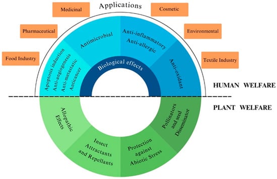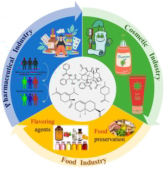 Terpenoids, found in almost all classes of living organisms, represent the largest group of natural compounds and have an extraordinary structural diversity, being derived from carbon backbones of 2-methylbuta-1,3-diene (isoprene units, C5) rearranged into linear and cyclic structures. They are classified as monoterpenes (2 C-5 units), sesquiterpenes (3 C-5 units), diterpenes (4 C-5 units), triterpenes (6 C-5 units), and so forth, and are categorized into six fundamental classes: tocopherols, taxanes, ingenanes, artemisinins, sterols, and cannabinoids [1]. Some of them have been shown to possess a wide range of biological activities, including antioxidant, anti-inflammatory, antimicrobial, anticancer, and antiallergic properties (Figure 1) [1]. They have huge economic value as well as a wide range of applications in different fields, including the food, pharmaceutical, cosmeceutical, and chemical industries, in addition to their environmental value (Figure 1).