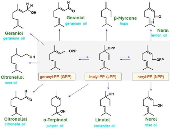 The condensation of DMAPP and IPP in head-to-tail mode (nucleophilic attack of IPP’s terminal double bond on the especially reactive allylic carbon of DMAPP) provides a 10-carbon skeleton of geranyl diphosphate (GPP), which is the immediate precursor of all monoterpenes. A further IPP addition to GPP’s allylic carbon leads to the formation of farnesyl pyrophosphate (FPP), which is the precursor of sesquiterpenes (15 carbons) and another IPP addition yields geranylgeranyldiphosphate (GGPP) as a precursor of diterpenes (20 carbon). All these additions are “head-to-tail”, connecting C1 from one unit to C4 of the next unit. Triterpenes (30 carbons) and tetraterpenes (40 carbons) result from the dimerization of FPP and GGPP, respectively, in a “tail-to-tail” fashion condensation. Monoterpenoids and sesquiterpenoids show an enormous variety of structures due to the instability of the carbocations resulting from the removal of the terminal diphosphate group from GPP and FPP, respectively. Due to cyclase enzymes, which catalyze the formation of a cyclic compound, GPP can undergo isomerization to nerylPP or rearrangement to linalylPP, from which cyclic structures may occur (Figure 2).