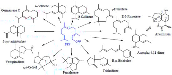 Farnesyl pyrophosphate (FPP) is the precursor to sesquiterpenes. It can hydrolyze farnesol or rearrange nerodyl pyrophosphate, which is the substrate of several enzymes in the cyclase family, giving rise to monocyclic sesquiterpenes, such as humulene, longifolene, germacrene, and bisabolene. Bi- and tricyclic chain structures and polycyclic spiro structures are common. There are more than 200 different cyclic structures. The different sesquiterpene carbon skeletons are formed through irregular coupling reactions. Cyclization is initiated by the metal-ion-induced ionization of pyrophosphate (PP) to form allyl cations, facilitating the structural shift and catalyzing cyclization closure. FPP undergoes one or more cyclizations to form intermediates, which are then converted to sesquiterpene skeletal end-products under the action of the synthase enzyme [5].