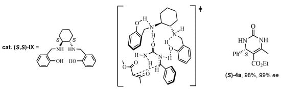 Transition state for cat (S,S)-IX by a network of cooperative hydrogen bonds (NCHB) in the synthesis of the DHPMs (S)-4a.