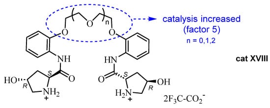 A variation of this methodology by these authors consisted of the incorporation of a polyether spacer in the (2S,4R)-hydroxyproline derivative cat XVIII [55], allowing the authors to enhance the effect on the enantioselectivity of the Biginelli reaction by a factor of five. The best results were achieved for salts of these podands with trifluoroacetic acid (Figure 6).