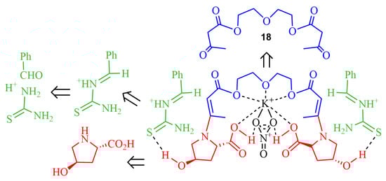 Very recently, a new work has been published by this group [60]. This work showed the relevant role of the hydroxyl group of the chiral inductor cat (S,S)-XIXb (based on trans-4-hydroxyproline) in obtaining the target podand 17, enriched with the (R,R)-enantiomer. Considering the iminium mechanism, the hydroxyl group promotes the prochiral Si-face of the Schiff base with a maximum of 75% ee (Scheme 16). It should be noted that a known hydroxyphenyl analogue of 17 inhibits the activity of the motor protein Eg5.