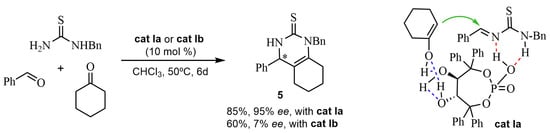 Lately (in 2020, [29]), the latter research group proposed a plausible chiral transition-state structure in the Biginelli-like reaction catalyzed by the phosphoric acid cat Ia, with cyclohexanone as an enolizable compound, to obtain the bicyclic asymmetric pyrimidines 5 (Scheme 2). In this model, the chiral cat Ia activates the intermediate imine. The two hydroxyl groups form intramolecular and intermolecular H-bonds with the enolizable ketone, favoring the stereoselective attack of the enol on the imine. When the methoxy derivative cat Ib was used as a catalyst, the enantiomeric excess was lower, indicating that the two hydroxyl groups were indispensable for attaining a higher enantioselectivity (Scheme 2).