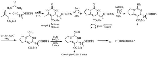 The spirocyclic phosphoric acid cat III was used in another asymmetric reaction to obtain 4-alkyl-3,4-dihydropyrimidin-2-(1H)-one (4-alkyl-DHPM) scaffolds with good yields and enantioselectivity (Scheme 4). Subsequent studies showed that this strategy was optimal for the synthesis of the structural core of Batzelladine A. Thus, this procedure [34] improved the results reported in the literature [32], providing the bicyclic guanidine fragment of (+)-Batzelladine A 9 in only 6 steps and 22% of total yield (compared to previous 12 steps and 13% of total yield, see Scheme 5) [32].