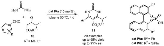 On the other hand, taking into account that the chiral 6-isopropyldihydropyrimidines 11 are very important intermediates for statin drugs, an organocatalyzed ABR was designed [35]. The chiral BINOL-derived phosphoric acid cat IVa catalyzed the condensation of aromatic aldehydes, β-dicarbonyl compounds 10, and thiourea, in the asymmetric synthesis of 6-isopropyl-3,4-dihydropyrimidines 11 obtained with good yields and enantioselectivities (Scheme 6). Recently, Chetty et al. in 2024 [36], studying the optimal solvent conditions for obtaining 11, carried out the enantioselective reaction of nitrobenzaldehyde, acetoacetate, and thiourea in the presence of silylated cat IVb, (Scheme 6). It was shown that both toluene and cyclopentyl methyl ether gave equivalent results in both cases (99% yield and 92% ee).
