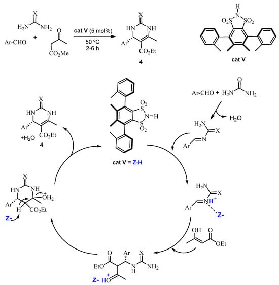 Barbero et al. [40] reported the use of a derivative of 1,2-benzenedisulfonimide as a chiral Brønsted catalyst (cat V) for ABRs. These authors used different reagents (aromatic aldehydes, urea or thiourea and ethyl acetoacetate) and 5 mol% of the catalyst cat V under neat conditions and heating at 50 °C. High yields of DHPMs (average 91%) and enantiomeric excesses (average 97%) were achieved. In addition, they proposed a mechanism for the enantioselective formation of the DHPMs 4 with cat V (Scheme 8).