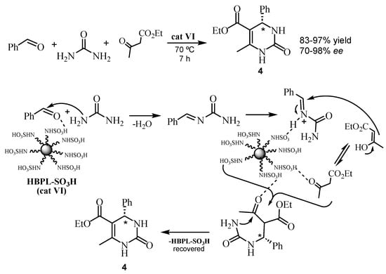 The proposed mechanism for the Biginelli reaction in the presence of the catalyst HBPL-SO3H (cat VI).