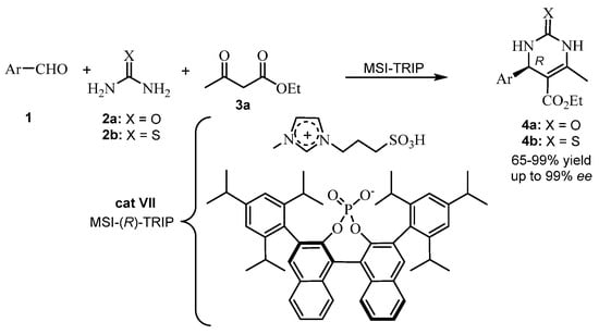 In 2018, Alvim et al. [43] studied the ionic liquid effect (ILE) combined with an asymmetric counteranion-directed catalysis (ACDC) in an ABR. Ionic liquids bearing chiral anions were chosen as catalysts for enantioselective Biginelli reactions (Scheme 10). The reaction mechanism (via iminium) was elucidated using electrospray (tandem) mass spectrometry (ESI-MS/MS). Chiral induction arises from a supramolecular aggregate where the anion and the cation of the catalyst [MSI-(R)-TRIP] (cat VII) are alongside a key cationic intermediate of the reaction, with each component being essential for the chiral induction success. The resulting enantiomeric excesses of the THPMs 14 were measured by chiral HPLC analyses. The absolute stereochemistry of one THPM was confirmed with the literature data, and only the (R) isomer was formed (Scheme 10) [43].