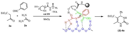 The methodology was extended by using a variety of nanosized metal oxides (NiO, Fe3O4, CuO, Al2O3, SiO2, and TiO2·SiO2) [56]. The dihydropyrimidinethione-containing podand (R,R)-17 (Figure 7) was synthesized by an asymmetric Biginelli-like reaction. The best result was achieved in the presence of nanooxide of NiO and 4-hydroxy-L-proline under mild conditions (70% ee and a moderate yield). Related experiments reported by these authors encompassed metal salts (especially metal nitrates) as additives, to study plausible complexes’ formation in the transition states (Figure 8) [57]. In another publication, it was shown that the combined system L-proline/SiO2·Mg(OH)2 as a catalyst led to an enhanced enantiomeric excess of some ABR products of up to 18% [58]. The ee values were determined by high-efficiency liquid chromatography.