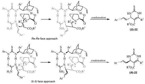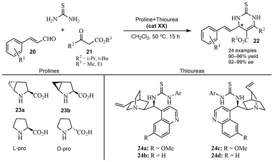 A number of asymmetric multicomponent reactions are catalyzed by thiourea-based organocatalysts. Thus, in ABRs, chiral organic compounds possessing a thiourea skeleton have been shown to be useful in the enantioselective formation of dihydropyrimidine thiones [61]. Early work was reported with a bifunctional primary amine, with TfOH as a chiral phase-transfer catalyst, and with t-BuNH2·TFA as an additive, showing moderate enantioselectivities [62]. Good examples are the syntheses depicted in Scheme 17. A series of α,β-unsaturated aldehydes 20 and various β-ketoesters 21 reacted in an ABR catalyzed by a proline/thiourea-based dual system (cat XX) [63,64]. Preliminary studies [63] were carried out with methyl or ethyl isobutyrylacetate in various solvents and different catalyst mixtures of prolines and thioureas, to find the optimum reaction conditions. The best results for the DHPTs 22 were obtained with the proline 23a (5 mol%)/thiourea 24a (5 mol%), providing excellent yields (90–96%) and high enantioselectivities (92–99% ee) [64]. A plausible transition state was proposed to explain the observed asymmetric induction. The role of the H-bonding, involved in the process, appeared to be crucial in the formation of the transition state (Scheme 18).