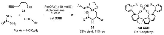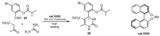 Chiral binol borane has been used as a Lewis acid catalyst in ABRs. For instance, the reaction of the 5-Bromo-2-acyl salicylaldehyde 25 with ethyl acetoacetate and urea using cat XXIII in THF led to a bromopyrimidine 26 [67]. The absolute configuration of a single crystal (S)-26 was determined by X-ray (Scheme 21).