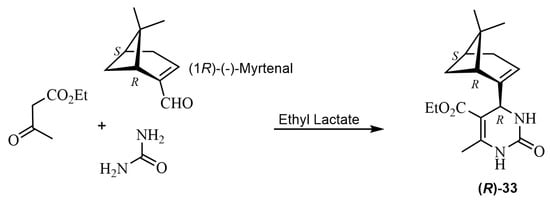 - Dias Benincá, L.A.; Pereira Ligiero, C.B.; da Silva Santos, J.; Junior, J.J.; da Silva, F.M. Eco-friendly and enantiospecific Biginelli synthesis using (+)-Myrtenal as the substrate–An impeccable and unequivocal analysis of the product. Curr. Org. Chem. 2020, 17, 389–395. [Google Scholar] [CrossRef] [PubMed]