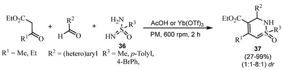 - Krauskopf, F.; Truong, K.-N.; Rissanen, K.; Bolm, C. 2,3-Dihydro-1,2,6-thiadiazine 1-oxides by Biginelli-type reactions with sulfonimidamides under mechanochemical conditions. Org. Lett. 2021, 23, 2699–2703. [Google Scholar] [CrossRef] [PubMed]