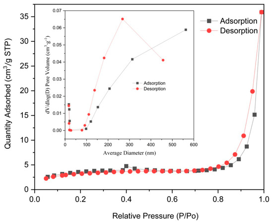 The FT-IR analysis (Figure 1) reveals prominent absorption peaks at 1565 and 1379 cm−1 for Co/Cd-MOFs, which can be attributed to the formation of two equivalent C-O bonds resulting from the delocalization of carboxyl groups [37,38]. The wide weak peak at 3119 cm−1 primarily arises from the stretching vibration of the C-H bond. The disappearance of characteristic peaks related to C-H and carboxyl groups in the benzene ring after the carbonization of Co/Cd-MOFs is evident from Figure 1. Notably, significant changes occur in the 2θ absorption peak of Co/Cd-MOFs before and after carbonization, as depicted in Figure 2. Furthermore, the analysis of nitrogen adsorption and desorption isotherms presented in Figure 3 reveals a measured BET specific surface area value measuring approximately 12.33 m2/g. The interaction between the adsorbed material and gas appears relatively weak as molecules tend to accumulate around regions with higher attractiveness on the surface. Furthermore, the SEM observations (Figure 4) confirm that excellent dispersion is achieved upon the carbonization of Co/Cd-MOFs.