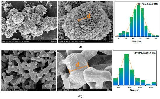 SEM of Co/Cd-MOFs before and after carbonization ((a), precarbonization; (b), carbon compound).