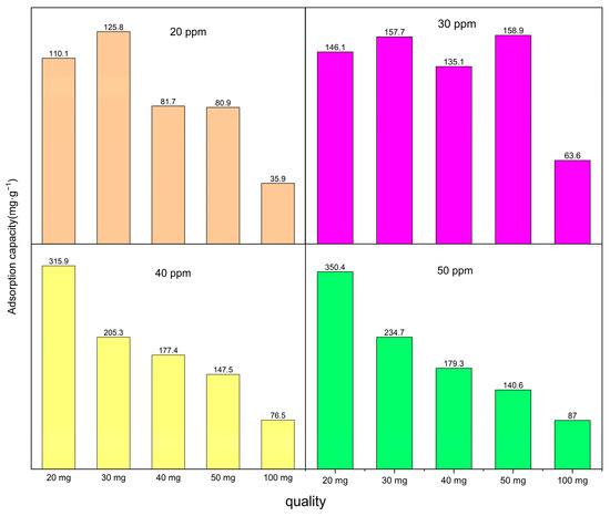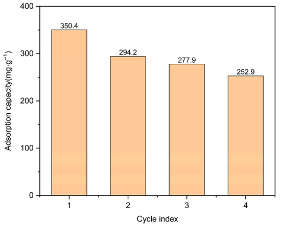 This study investigated the characteristics of carbonized Co/Cd-MOF materials and their effectiveness in removing moxifloxacin, a targeted pollutant. The adsorption time, amount of Co/Cd-MOF carbon materials, and concentration of moxifloxacin solution were systematically manipulated for thorough exploration. As shown in Figure 5, when using 100 mg of Co/Cd-MOF carbon material and a moxifloxacin solution with a concentration of 50 ppm, an impressive removal rate of 88.9% was achieved within a span of 5 h. Additionally, the experimental results indicated that increasing the quantity of the Co/Cd-MOF carbon material under constant moxifloxacin concentration conditions resulted in higher removal rates due to the enhanced exposure and involvement of active sites during the adsorption process. Conversely, when keeping the quantity of the Co/Cd-MOF carbon material constant, lower concentrations for moxifloxacin solutions corresponded with a decreasing trend in the removal rate as more molecules competed for each active site during the adsorption process. Moreover, by reducing the amount of the Co/Cd-MOF carbon material to 20 mg while maintaining the same concentration for the moxifloxacin solution, an exceptional adsorption capacity reaching up to 350.4 mg/g within the same timeframe was observed on the Co/Cd-MOF carbon material surface (as shown Figure 6). The adsorption capacity can be enhanced by improving the quality of the adsorbent, as this will provide a greater number of active sites for adsorption, thereby increasing the likelihood of successful adsorption. Additionally, an increase in the mass of the adsorbent allows for a higher quantity of molecules to be adsorbed, resulting in an increased overall amount of adsorption. Furthermore, the concentration of the material being absorbed also influences the extent of adsorption. When there is a higher concentration of absorbate present, more interactions occur between absorbate molecules and the surface of the adsorbent, leading to an augmented level of adsorption. The adsorption capacity of the adsorbent is limited, and upon reaching a certain concentration level, the adsorption sites become saturated, resulting in no further increase in the adsorption amount. As shown in Figure 7, following four cycles, the sample exhibits an impressive adsorption capacity of 252.9 mg/g, demonstrating the recyclability of the Co/Cd-MOF carbon material for moxifloxacin removal. This distinction primarily lies in the disparity between chemisorption and physical adsorption, as well as their respective characteristics. In contrast, chemisorption arises from the chemical bonding forces between the adsorbate and adsorbent, typically resulting in monolayer adsorption. This necessitates specific activation energy and exhibits notable selectivity.